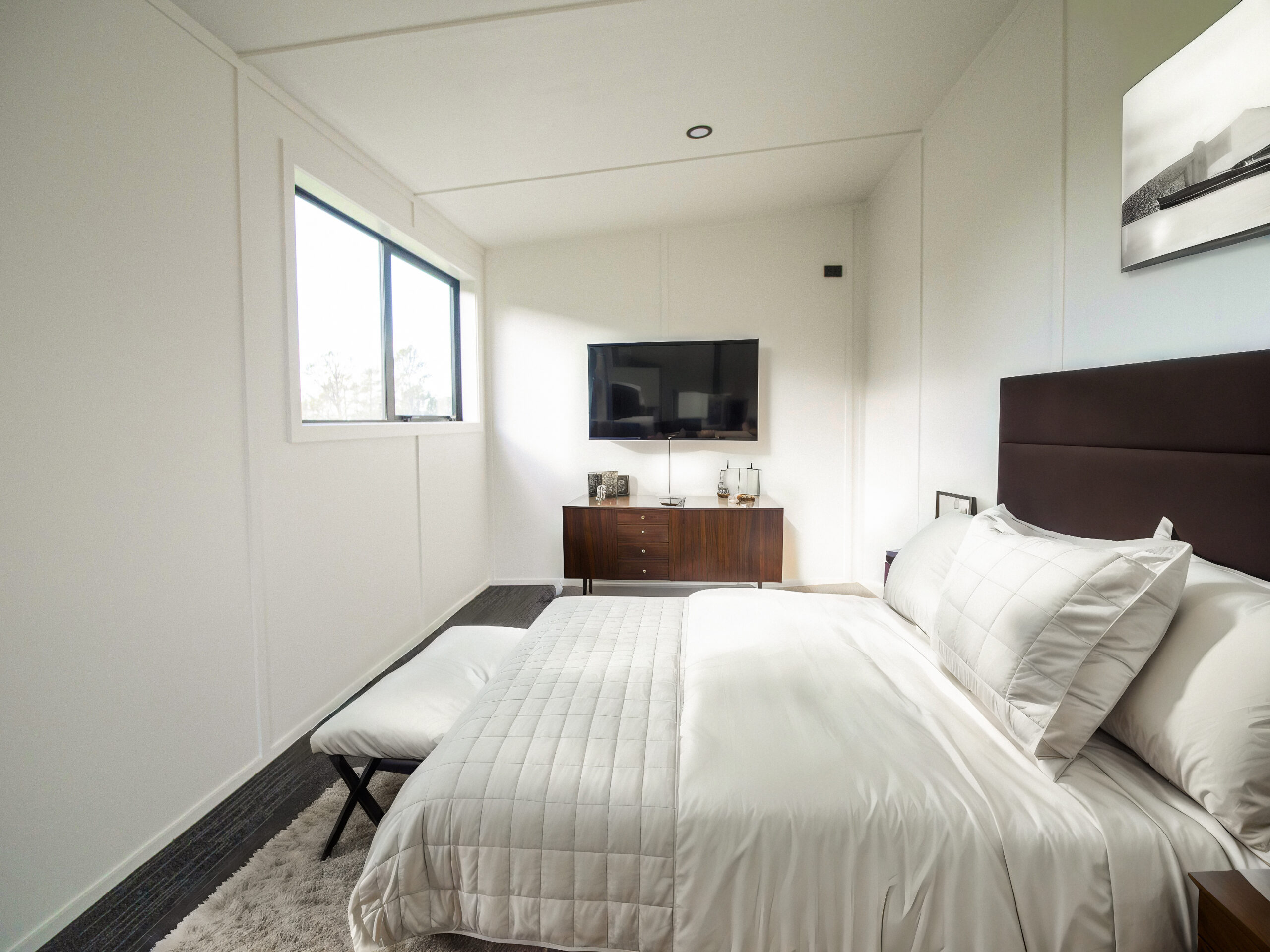 The Matakana Cabin is a single room with a monopitch roof design. It has external dimensions of 5.5 meters in length and 2.8 meters in width, which includes a covered entry and a deck.