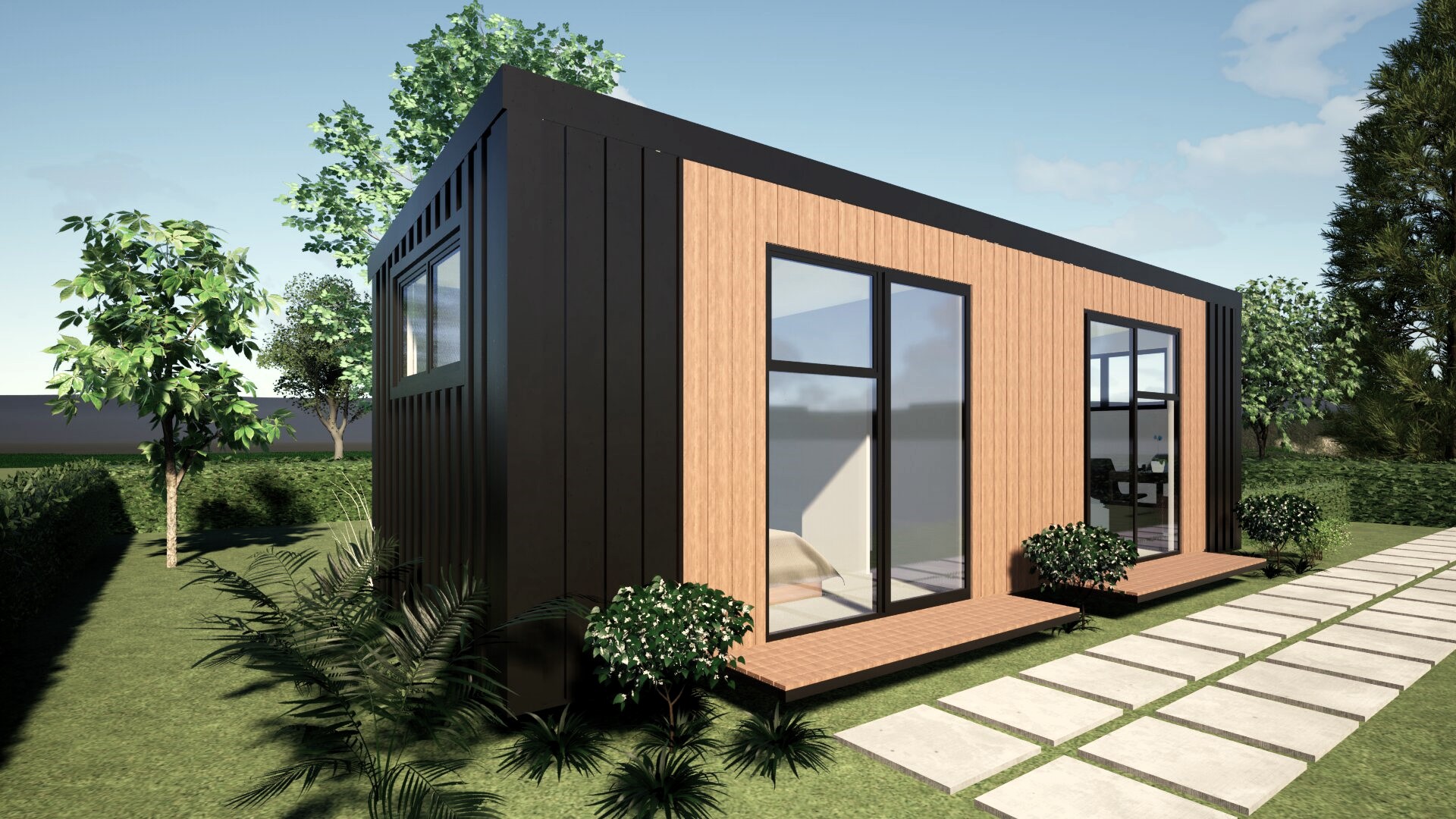 It is designed with monopitch roof lines and has external dimensions of 7.8 meters in length and 2.8 meters in width, plus two entry decks.